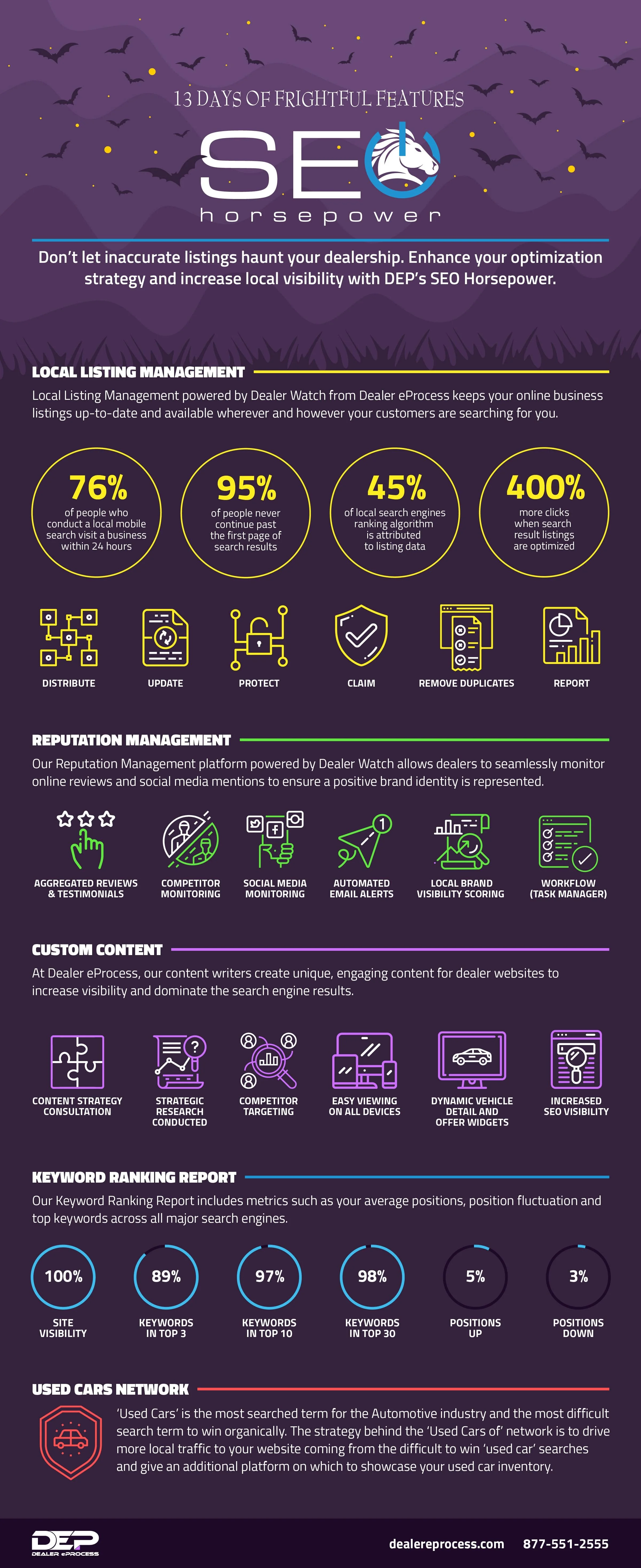 Frightful Features is a social media campaign that I lead in October 2019. With a heavy focus on what Dealer eProcess products offer vs what competitors don’t. This was a collaboration with a videographer that shot and edited 9 video scripts that I wrote, along with multiple salespeople who wrote blogs. This social campaign was a great hit not only throughout the company, but our customers, who mentioned seeing the videos to the account executives. It was a great way to show a lighter side of the company, and put a fun spin on promoting products!